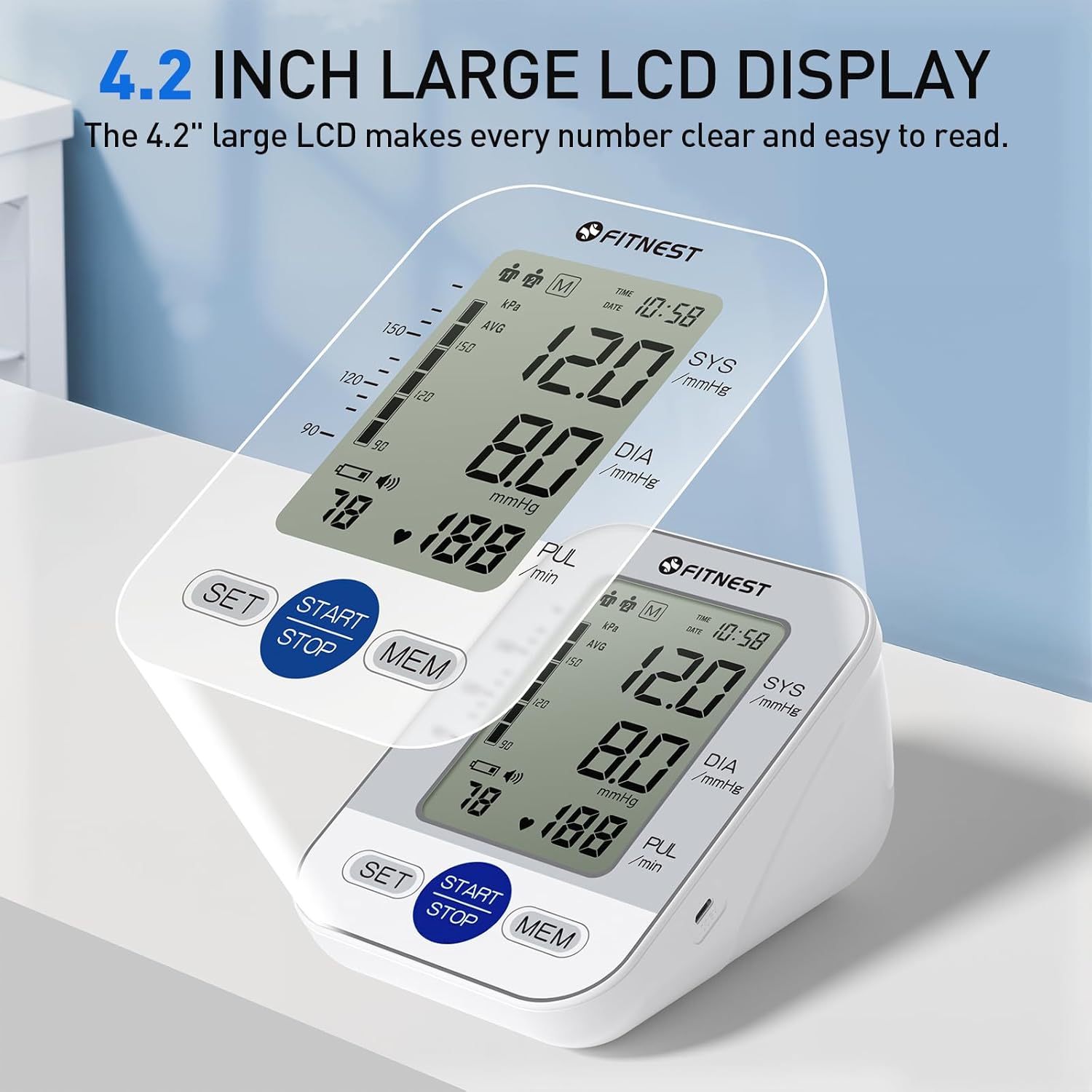 A large 4.2-inch display makes readings crystal clear and easy to read from any angle, even without glasses. No more squinting at tiny numbers.