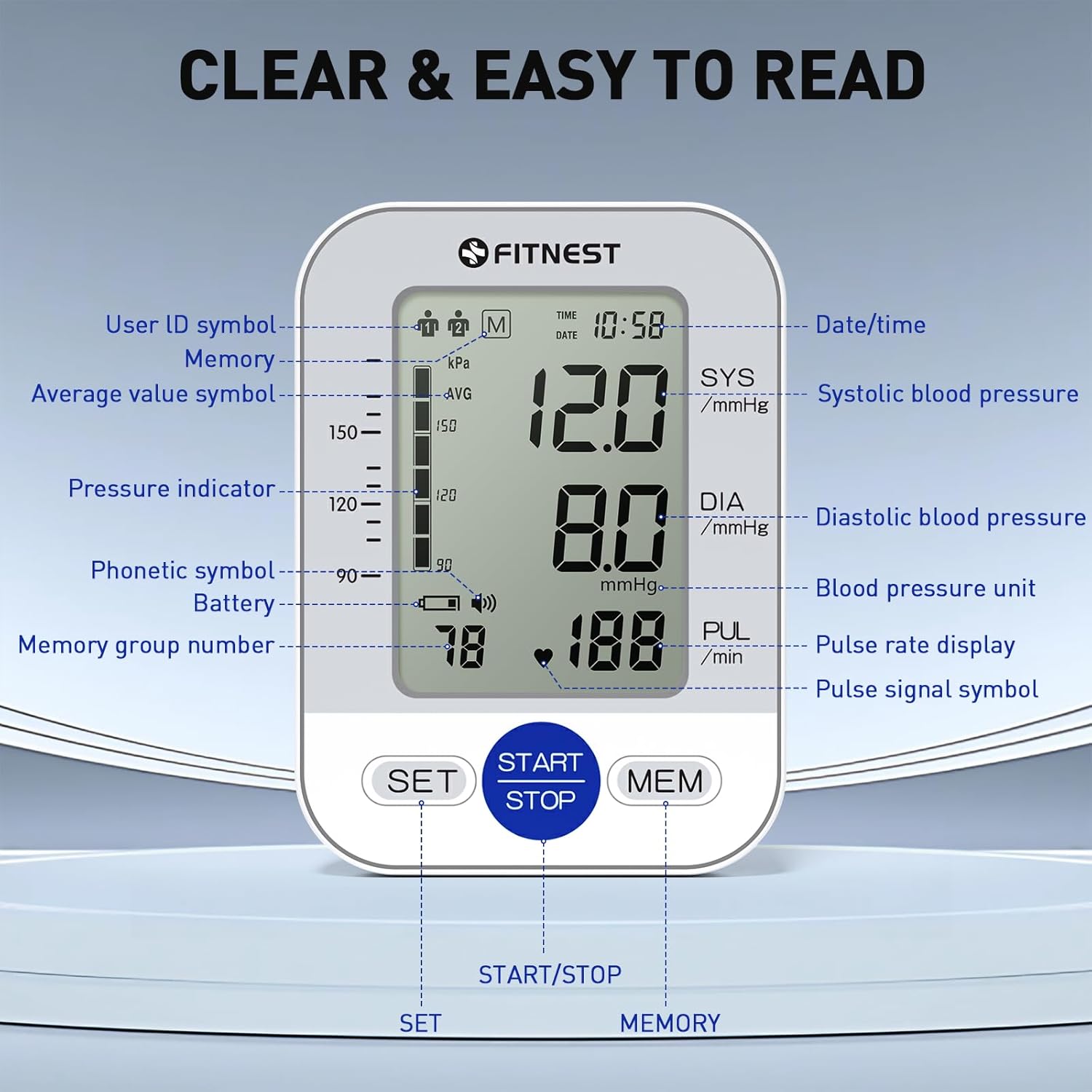 Easy-to-Read Display: This home blood pressure monitor features a large, high-contrast LCD screen with a soft backlight and oversized numbers. View your blood pressure and pulse rate clearly, day or night, for effortless monitoring.