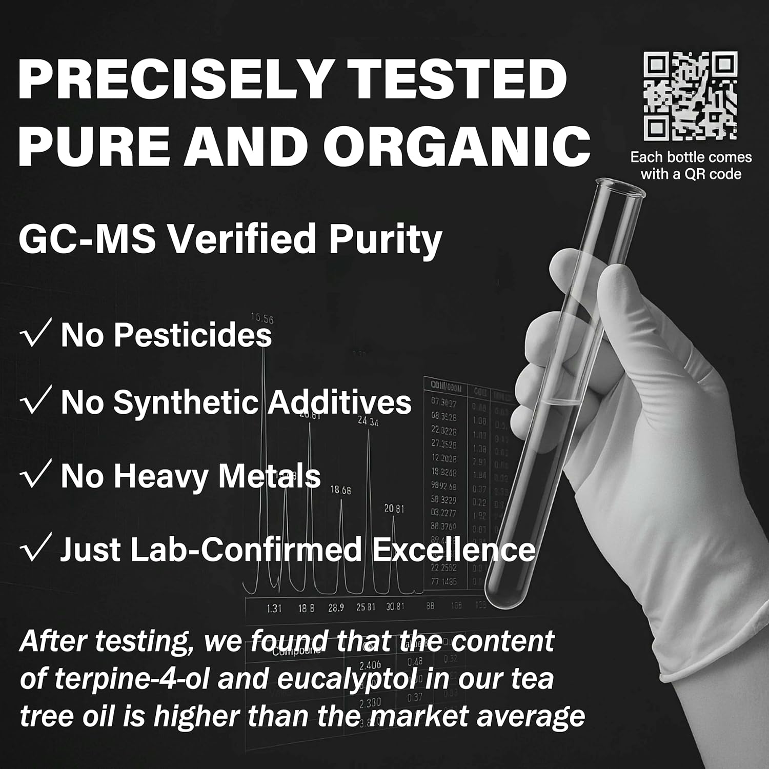 RIGOROUS QUALITY ASSURANCE: Every batch of our Tea Tree Essential Oil is independently tested by third-party laboratories to ensure unmatched purity, potency, and safety. We use GC-MS analysis, the gold standard in essential oil testing, to verify the identity and concentration of key compounds like terpinen-4-ol and cineole. This guarantees consistency in quality and ensures you receive natural tea tree oil exactly what’s on the label—every single time. We also test for contaminants like heavy metals, pesticides, microbial growth, and synthetic additives. Each bottle melaleuca tea tree oil comes with a QR code that you can trace to a full lab report, offering transparency and peace of mind