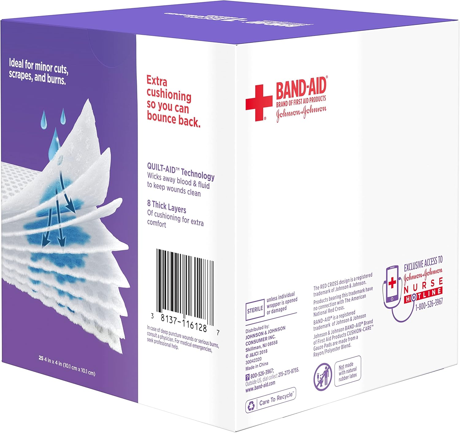 A covered wound heals faster than an uncovered one. BAND-AID Brand Sterile Cushion-Care Absorbent Gauze Pads for first aid and wound care are designed to protect minor cuts, scrapes and burns. Made with unique Quilt-Aid Technology, these individually-wrapped sterile gauze pads feature deep pockets to wick away blood and fluid from wounds to help keep them clean. Cushion-Care Gauze Pads have 8 thick layers of soft cushioning providing extra comfort for minor wounds. These large square sterile pads are 4 inches x 4 inches in size and can be used with BAND-AID Brand of First Aid Products Flexible Rolled Gauze to firmly secure the non-stick, absorbent gauze pad in place. From the #1 doctor-recommended brand, these non-adhesive gauze pads are essential first aid supplies and not made with natural rubber latex.