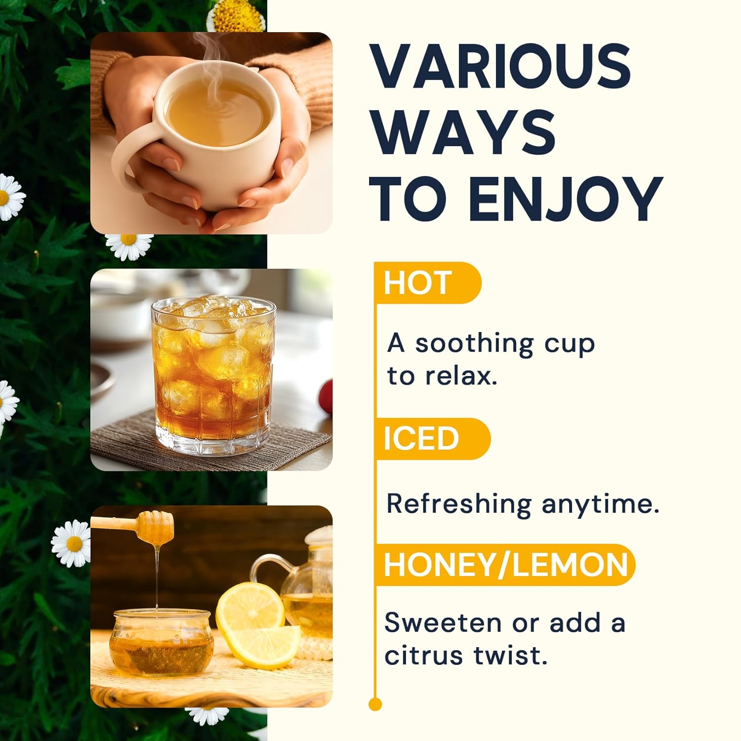 【Relax & Sleep Better】Known for its calming benefits, chamomile tea helps ease tension and promote relaxation. Enjoy a cup before bed for a peaceful night’s rest.