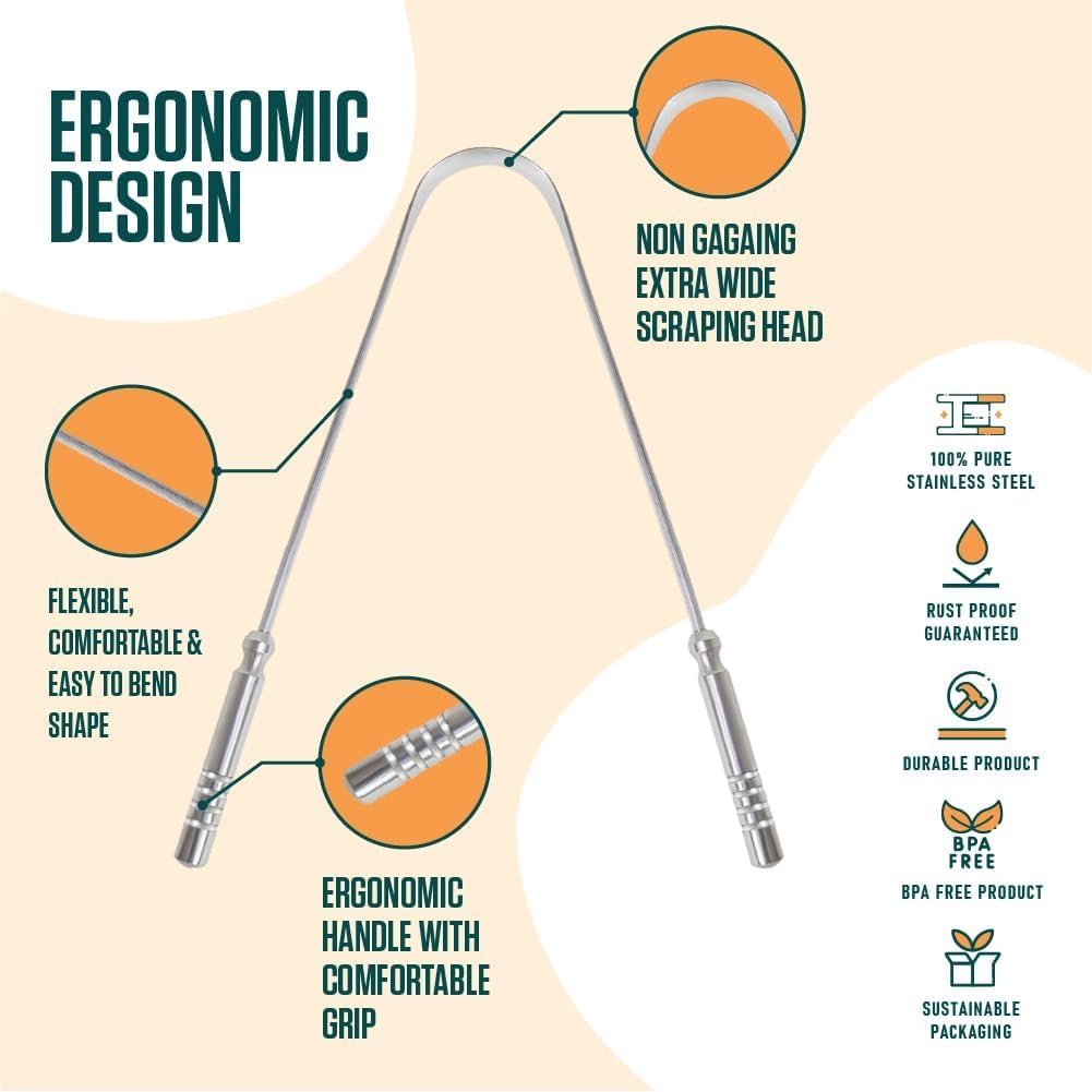 Key Features Premium Quality: Made from 100% stainless steel for durability. Fresh Breath: Effectively removes for long-lasting freshness. Ergonomic Design: Comfortable grip for easy use and thorough cleaning. Pack Options: Available in packs of 1 or 2 for convenience. Essential for Hygiene: Boosts oral health and enhances taste sensation.