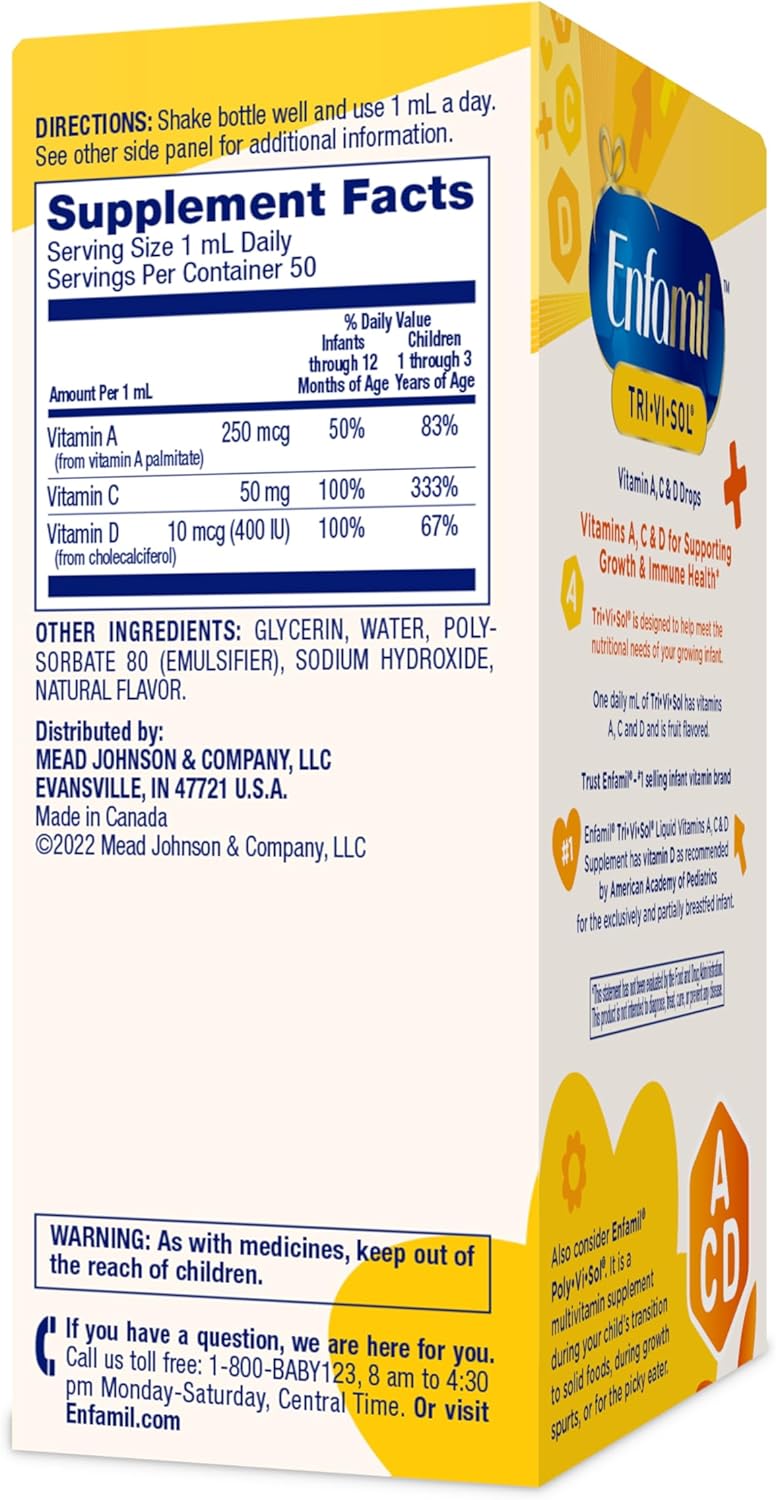 Enfamil Tri-Vi-Sol drops support babies 0-12 months who are breast fed or combo fed to complement the nutrient profile breast milk has. Tri-Vi-Sol multivitamin vitamin supplement has vitamin D to help your baby’s body absorb calcium for strong bone and teeth development, vitamin A to help support vision, healthy skin, bone and tooth growth, and immune system health, & vitamin C which is an antioxidant that supports protein metabolism, supports immune health, and promotes iron absorption. Tri-Vi-Sol is fruit flavored using natural ingredients and does not have ingredients derived from the most common food allergies. One serving has 100% of the daily value of vitamin D for breastfed infants from 0-12 months as recommended by the American Academy of Pediatrics (AAP), 100% of the daily value of vitamin C. The standard serving for Enfamil Tri-Vi-Sol is 1 milliliter (mL) per day. *These statements have been evaluated by the Food and Drug Administration. This product is not intended to diagnose, treat, cure or prevent any disease.