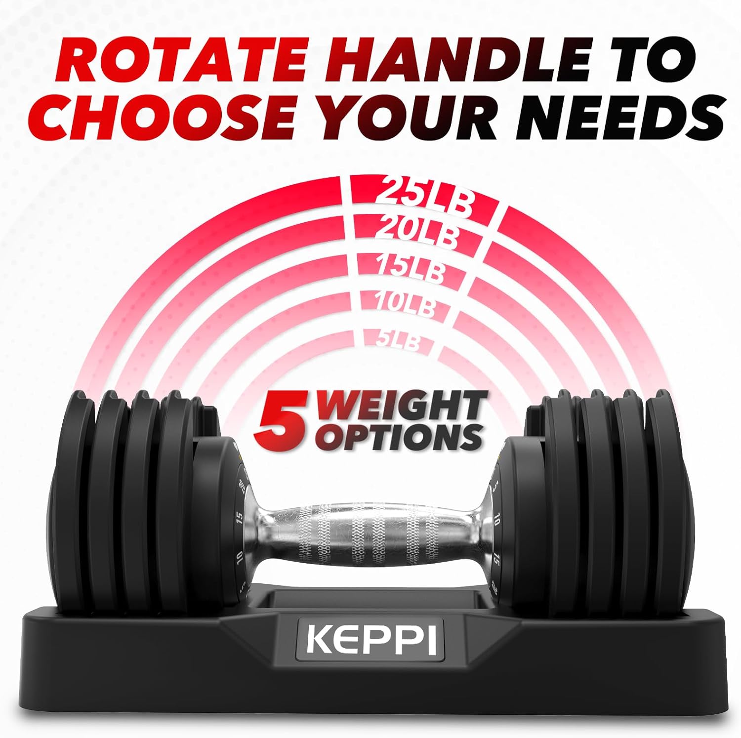 1 Second Weight Adjustment – With Keppi’s exclusive weight adjustment design, just turn the handle with one hand to adjust the weight of the dumbbells from 5lb to 25lb in 1 second! Enjoy more convenient adjustment experience and get better training efficiency.