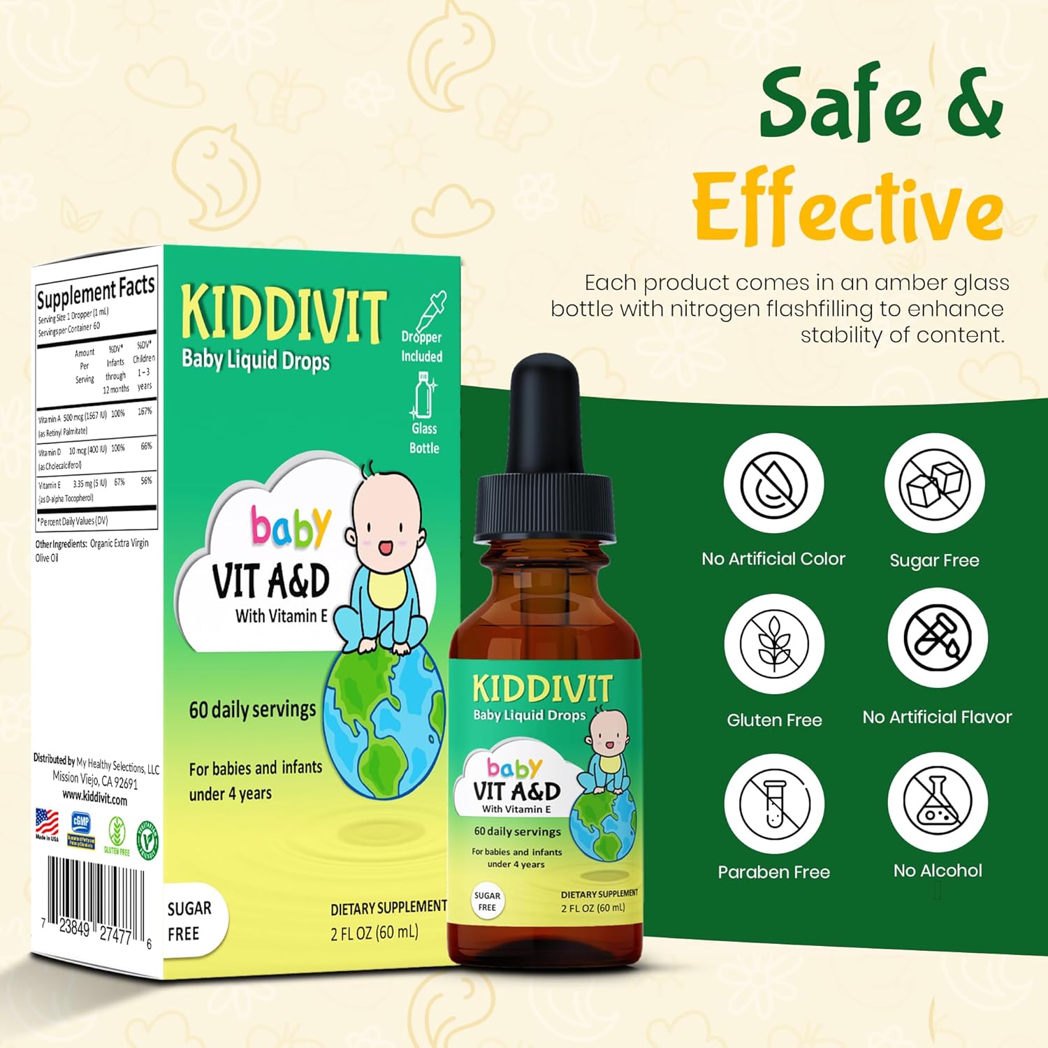 Kiddivit Baby Vitamin A&D Liquid Drops with Vitamin E – Gentle Immune & Vision Support Supplement – 60 Daily Servings, Dropper Included, Glass Bottle – Sugar Free, Gluten Free, Vegetarian, 2oz