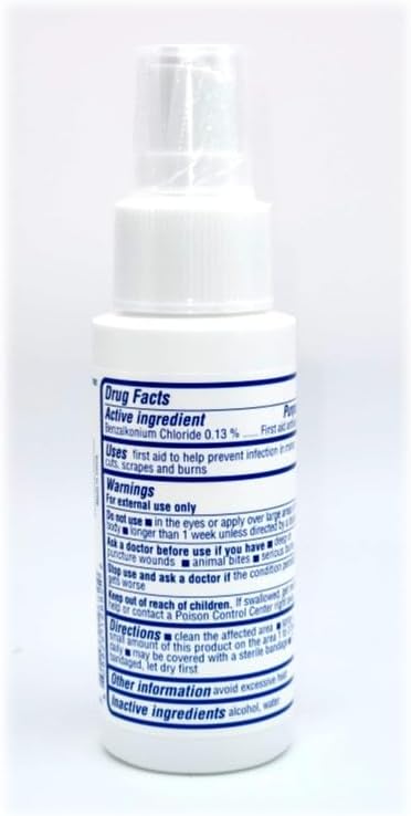 Keep your first aid kit stocked with this essential antiseptic spray, perfect for cleaning minor cuts, scrapes, and burns. Formulated with Benzalkonium Chloride, this non-sting solution helps prevent infection and promotes proper wound care.
