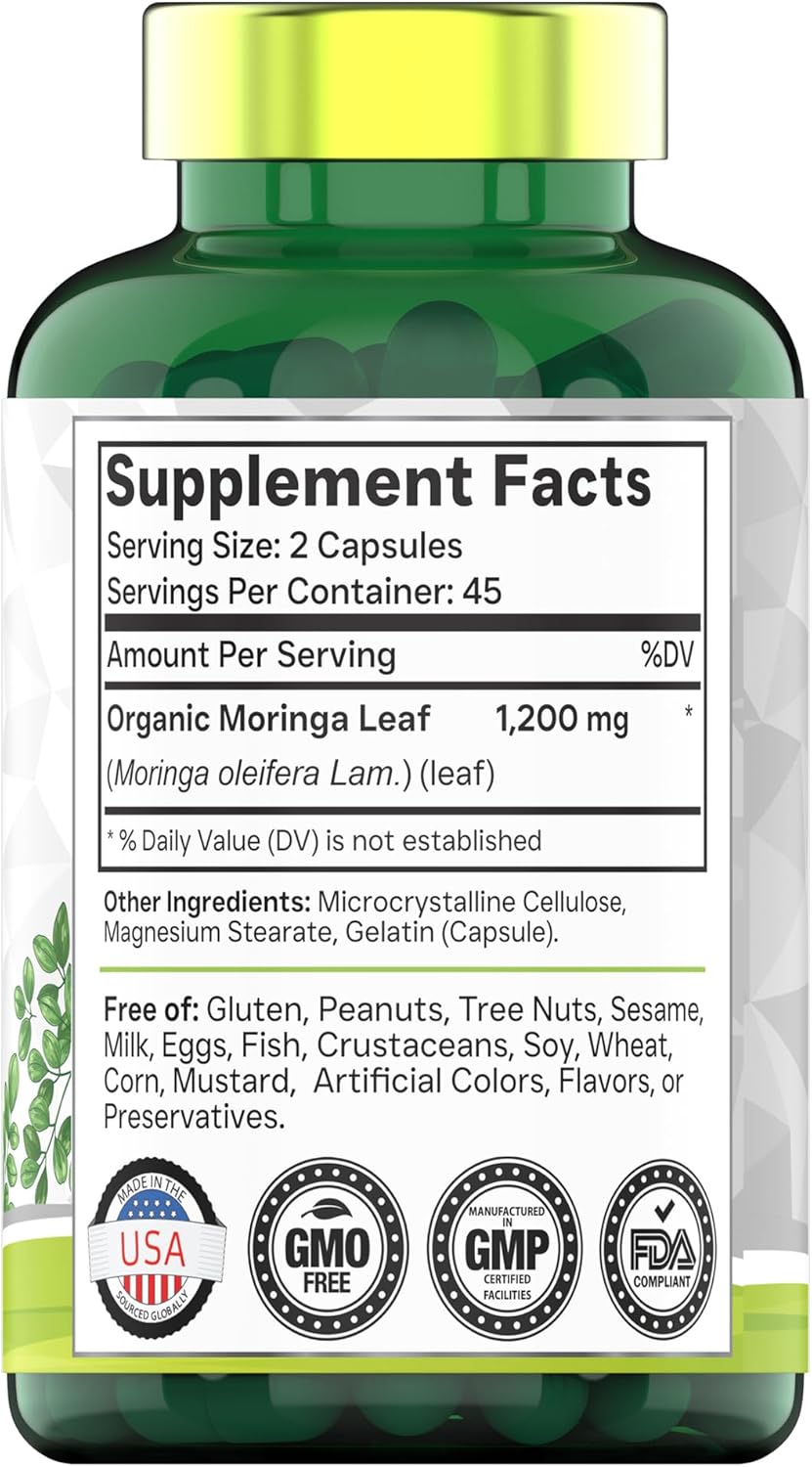 ✔️ Organic Moringa Leaf – 1,200 mg per Serving | 90 Capsules per Bottle: Each bottle contains 90 capsules delivering 1,200 mg of organic moringa leaf powder per daily serving. A clean, plant-based source of daily energy, vitality, and wellness support—no extracts.