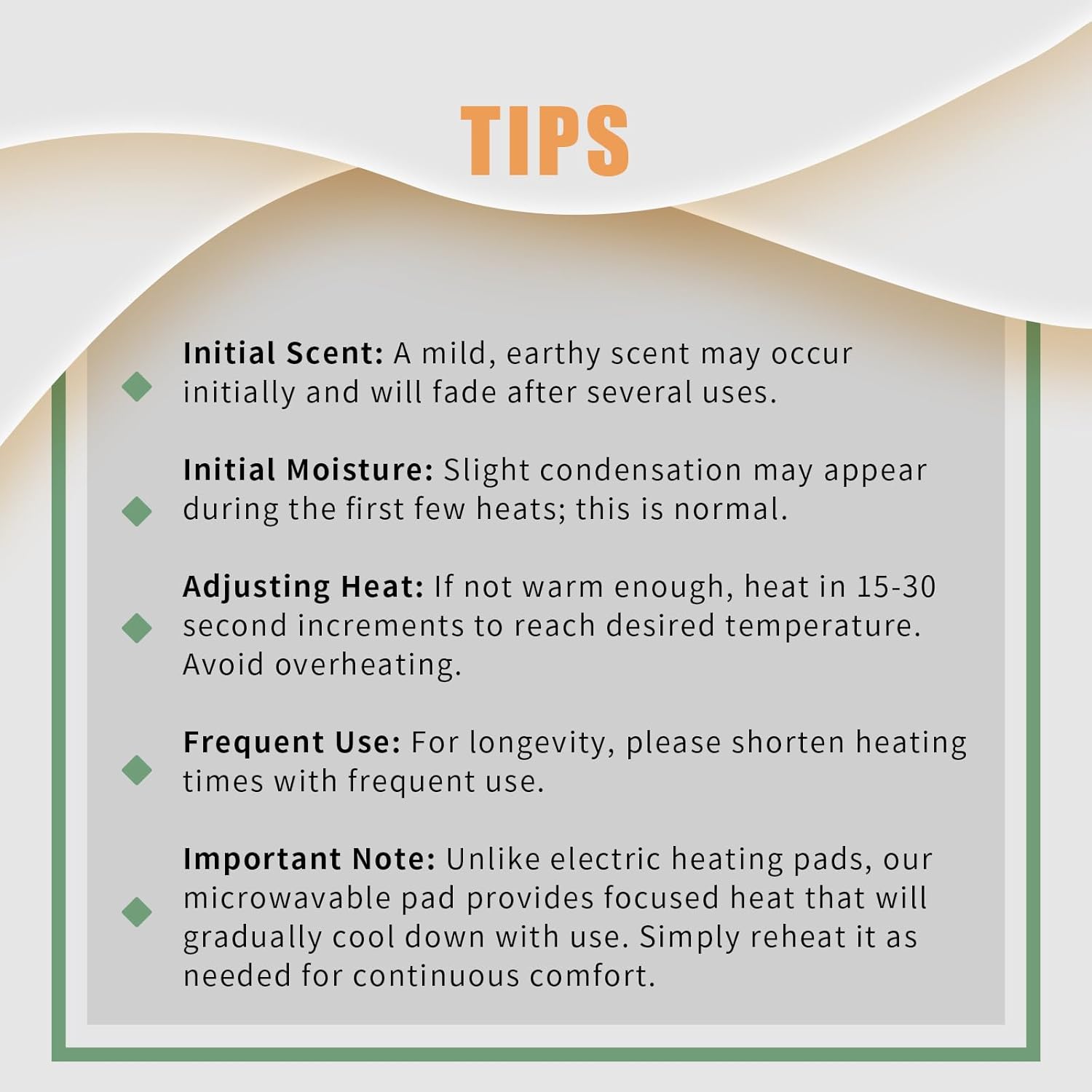 I bought this microwaveable heating pad to help with circulation issues, leg pain, and general aches and pains. If you’re on the fence or disappointed at first, this may still end up being perfect for you.When I first got it, I actually didn’t like it. It was extremely stiff. For the first several uses (about the first 10), it felt hard, not very bendable, and not at all malleable. I remember thinking, “How is this even usable?”Here’s the important part: it completely changed.After repeated heating and use, it finally “broke in.” The fabric softened a LOT, and the filling became flexible and moldable. Now it bends easily around my legs and body and feels comfortable instead of rigid. The difference between the beginning and now is night and day.Another unexpected bonus is the smell. It isn’t scented at all, but once it broke in, it developed this really pleasant, natural aroma from the filling — and the more I use it, the better it smells.It also retains heat very well, which is exactly what I need for pain relief and circulation support.If you buy this and your first reaction is, “Wow, this is way too stiff,” don’t give up immediately. Give it some time and some uses. I’m really glad I did, because now I love it and use it regularly.