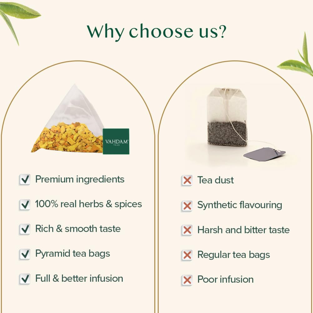 13 reviews for VAHDAM, Turmeric Ginger Herbal Tea Bags (30 Pyramid Tea Bags) Caffeine Free, Non GMO, Gluten Free | 100% Pure Herbal Blend – Savory & Spicy | Individually Wrapped Pyramid Tea Bags | Direct from Source